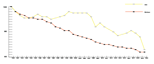 First, comparing reductions in methane and in CO₂ emissions. Graph 1 shows the evolution of both methane and CO₂ emissions in the EU27 for the period 1990 to 2020. While CO₂ emissions have seen a slight decrease between 1990 and 2005 (almost exclusively occurring in Central and Eastern Europe), methane emission reductions have been rather stable and have not visibly increased after 2005. By 2020, methane and CO₂ emission reductions are almost at the same level.