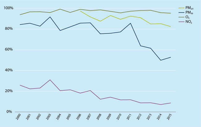 Figure: Percentage of EU urban population exposed to air pollutant concentrations above WHO air quality guidelines (2000–2015)