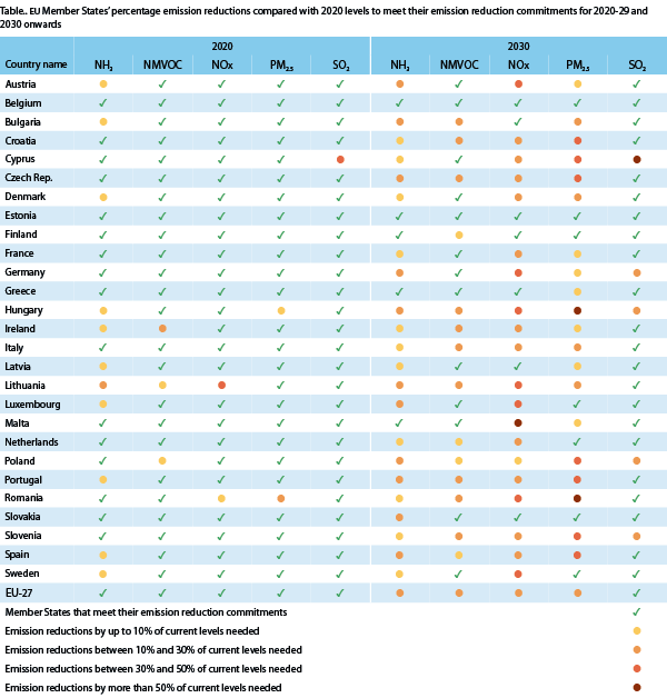 Regarding PM2.5 emissions, seven member states met their 2030 emission reduction commitments in 2020. Two countries, namely Hungary and Romania, will need to reduce their emissions by more than 50% from 2020 levels, while seven countries will need to reduce emissions by between 30% and 50%, and eleven member states by up to 30%.