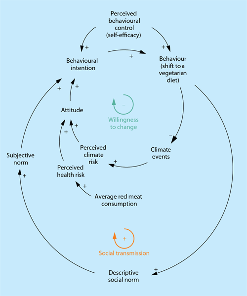 In the case of eating less animal products, the first theory implies that if many of your peers have adopted such a diet you are also more inclined to make a change. The second theory instead focuses on the importance of perceived risks. In this case the health risks associated with a high intake of meat and dairy and the perceived risks from climate-related events. Both theories recognise that individuals who experience obstacles to change are less likely to take action, referred to as low self-efficacy. A schematic illustration of how the researchers think these factors will affect a shift to a vegetarian diet is presented in figure 1.