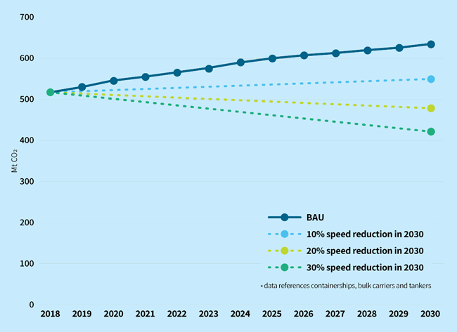 Reducing the speed of three main ship types by 30 per cent could decrease annual CO2 emissions by nearly 200 million tonnes.