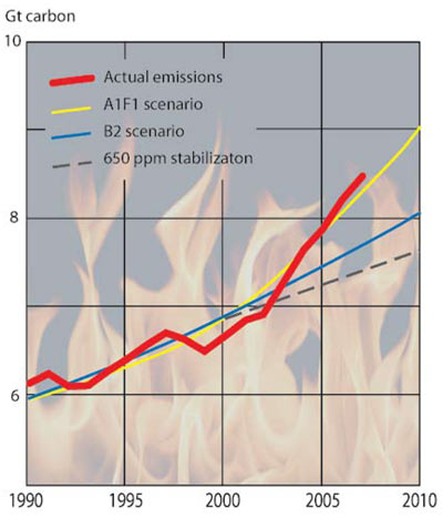 Actual global greenhouse gas emissions compared to two IPCC scenarios and to the development needed to stabilize atmospheric greenhouse gas concentration at 650 ppm.